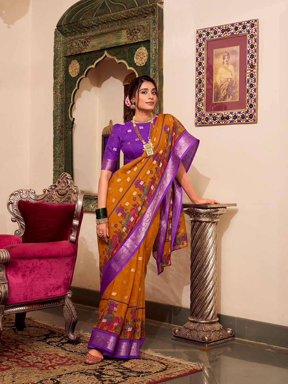 Mustard Color Kalamkari Print With Zari Weaving Work Poly Cotton Saree