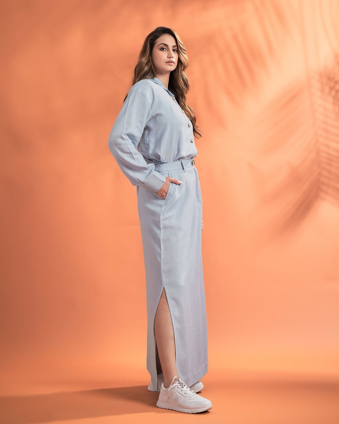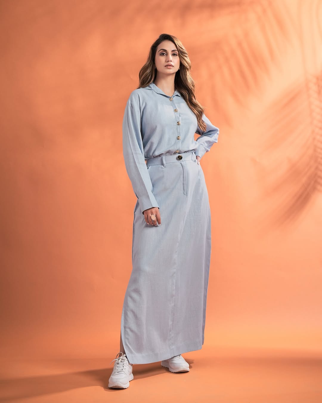 Elevate your everyday style with this elegant two-piece co-ord set, designed for a refined yet comfortable look. The set features a classic button-down shirt paired with a high-waist, straight-fit maxi skirt, creating a balanced silhouette that’s both modern and timeless.
